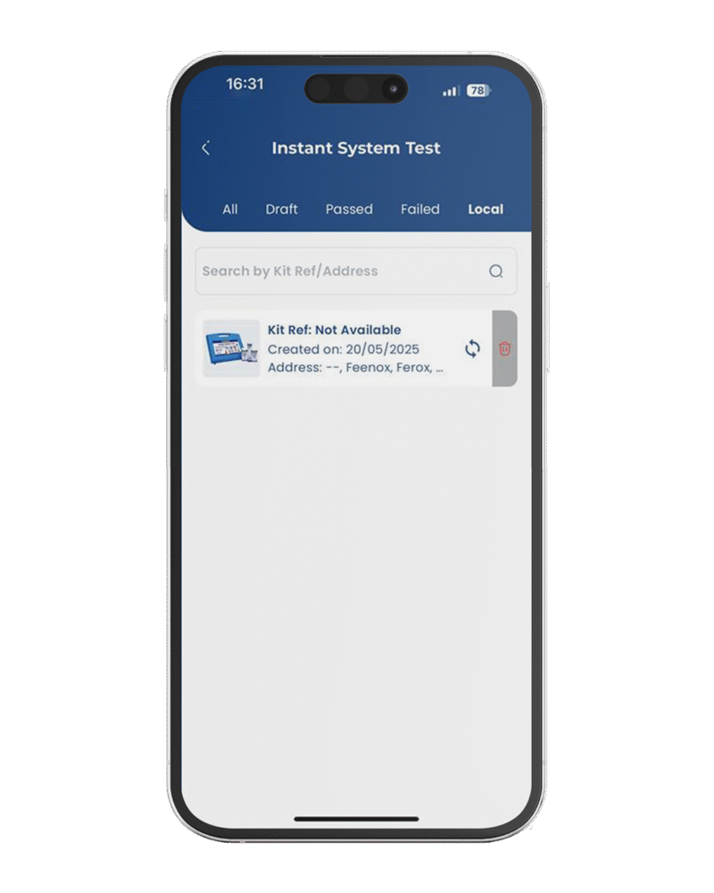 From the sidebar navigation, find the sample you wish to ‘re-sync’ from your tests stored in local storage. Select either the Express Inhibitor Test or the Instant System Test. Note that if you have offline-submitted samples of both types, they will need to be re-synced separately.