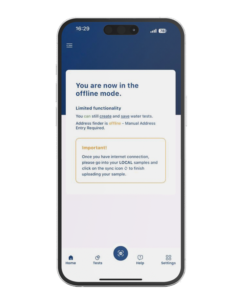Once you have completed a postal or on-site test and tapped Submit, a pop-up message will appear saying Saved test to local storage, confirming that your responses have been stored on your device.