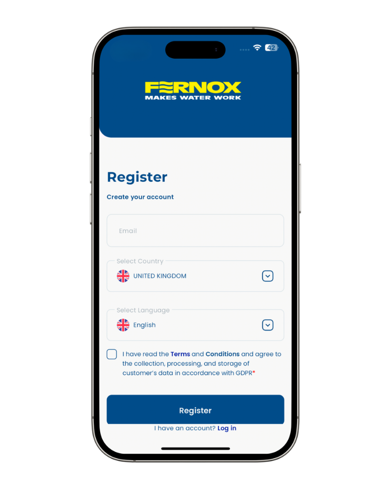 Open the Fernox App and select Click to register on the bottom section