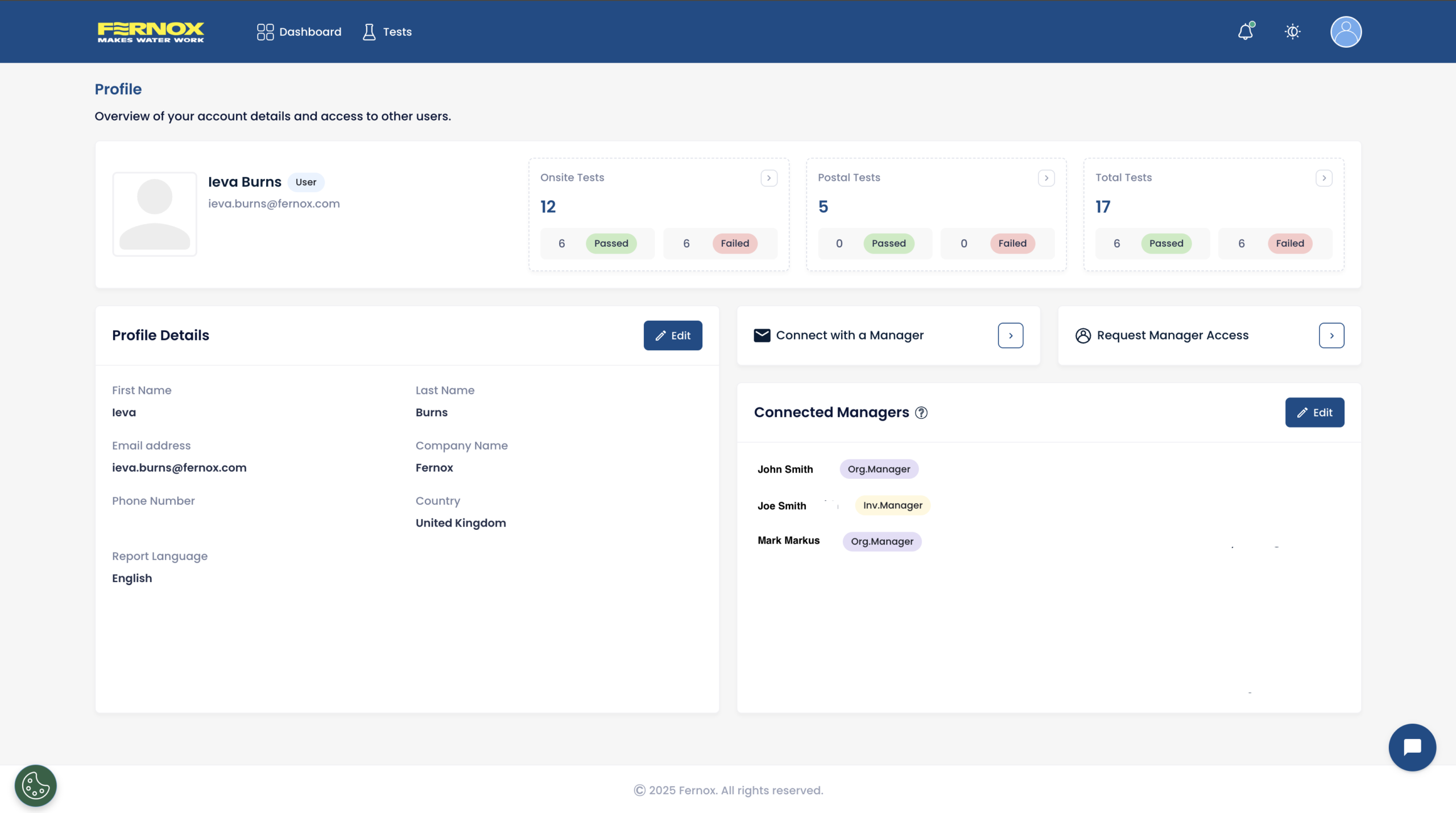 As part of your role, you might be required to share your water test submissions with other users, which we refer to as ‘Managers’, giving them additional permissions to view data either from everyone within their organisation, or to specific users whom they are invited to see. You can see more information by clicking here.