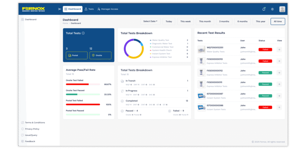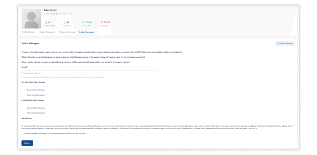 As a registered user of the Fernox App or web portal, you can invite a Manager to view your submitted samples. This is helpful if you want to share test results with someone responsible for managing your site, installation, or service.