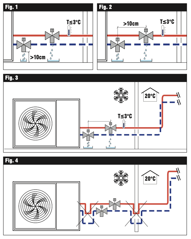 Bewaar een afstand van minstens 10 cm tot de grond (Fig. 1). Bewaar een afstand van minstens 10 cm tussen de antivriesventielen, zodat het boven geplaatste ventiel in geval van een ontlading niet op het ventiel eronder loost (Fig. 2).