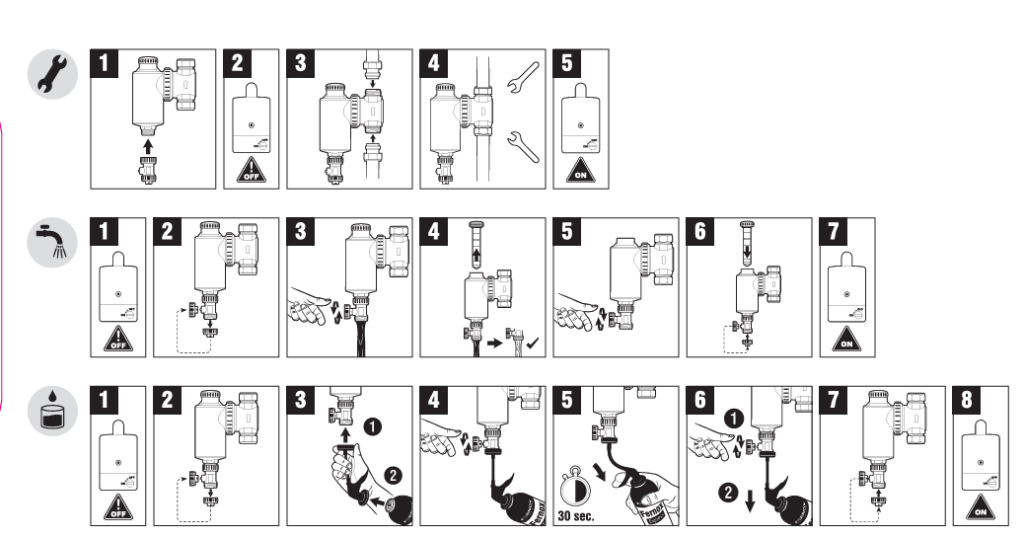Instale o filtro Fernox TF1 Omega, idealmente, no tubo de retorno para a caldeira. A unidade deve ser instalada verticalmente, mas pode ser posicionada a 45° se o espaço livre for limitado. Deixe espaço livre suficiente para remover o íman ao limpar a unidade. Como instalar: Como limpar: Como doseares (265ml): *Certifique-se de que a […]